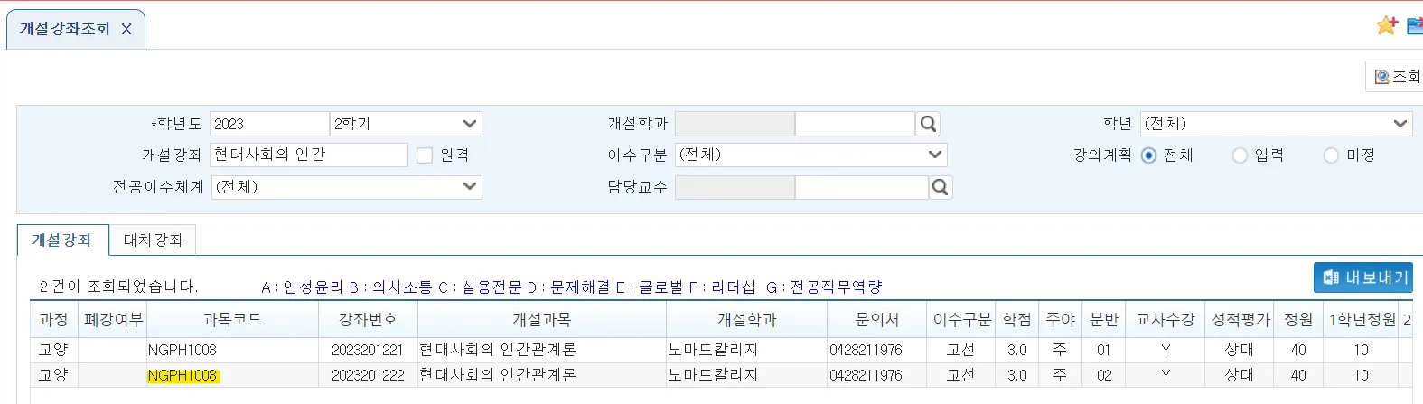 교과목 코드가 일치하는 강의를 확인하고 수강신청을 한다. 강의 이름은 바뀔 수 있으니까 반드시 교과목 코드로 확인해!!!