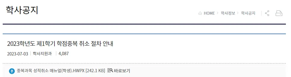 학기 끝나고 학교 홈페이지 “학사공지”에 “학점중복 취소 절차 안내”라고 공지 올라오면